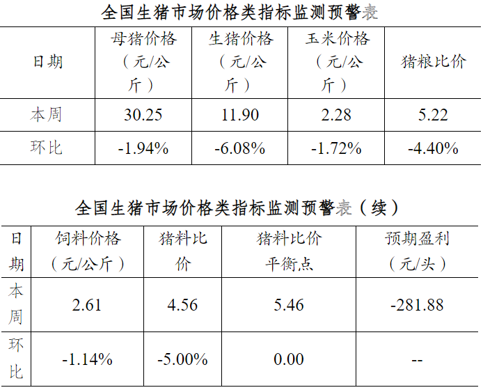 本周全国猪粮比价为5.22,环比下跌4.40%;全国猪料比价为4.56,环比下跌5.00%。按目前价格及成本推算,未来仔猪育肥模式的生猪养殖头均盈利为-281.88元。