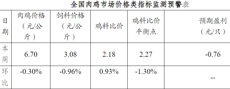 本周全国鸡料比价为2.18,环比上涨0.93%。按目前价格及成本推算,未来肉鸡养殖预期亏损0.76元/只。本周鸡价环比微降。