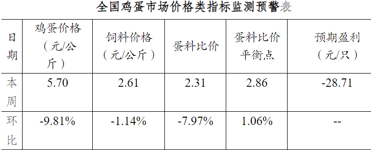 本周全国蛋料比价为2.31,环比下跌7.97%。按目前价格及成本推算,未来蛋鸡养殖每只亏损28.71元。