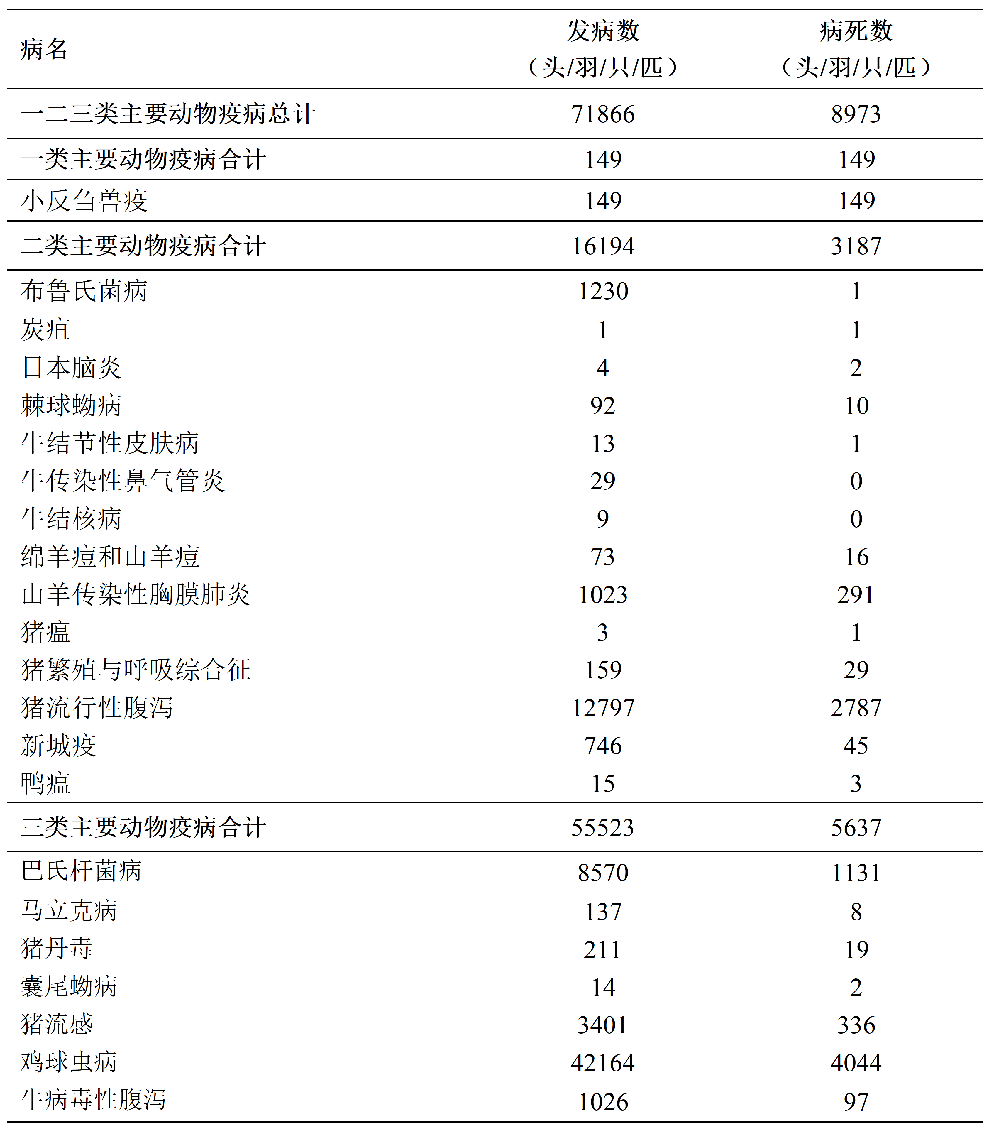 备注:本表统计数据来自各省、自治区、直辖市和新疆生产建设兵团报告发生的一二三类主要动物疫病信息。