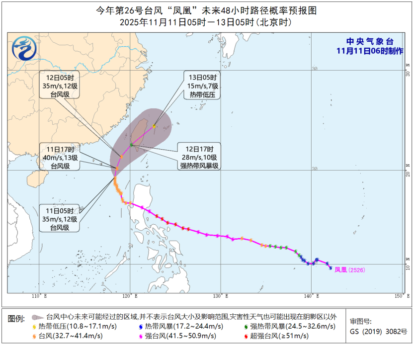 图1 台风“凤凰”未来48小时路径概率预报图(11月11日05时-13日05时)