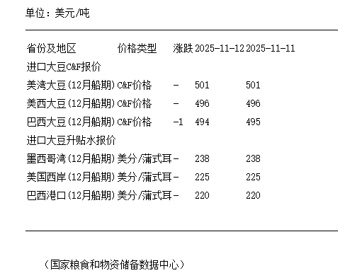 11月12日进口大豆到国内港口C&F及升贴水报价