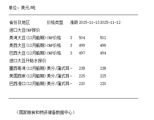 11月13日进口大豆到国内港口C&F及升贴水报价