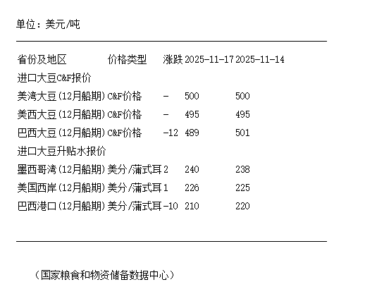 11月17日进口大豆到国内港口C&F及升贴水报价