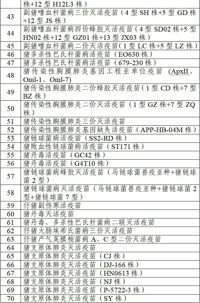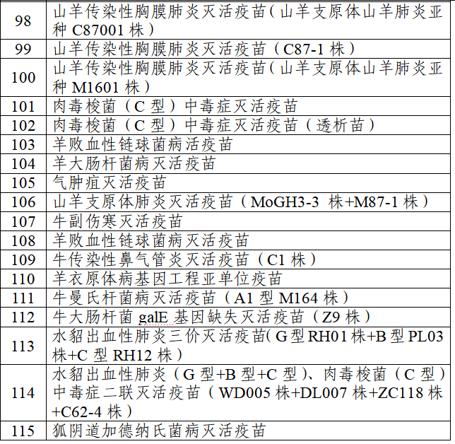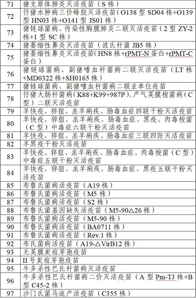 说明:本目录涵盖115种细菌类疫苗,其中禽用疫苗27种,猪用疫苗51种,牛羊用疫苗34种,皮毛动物用疫苗3种。