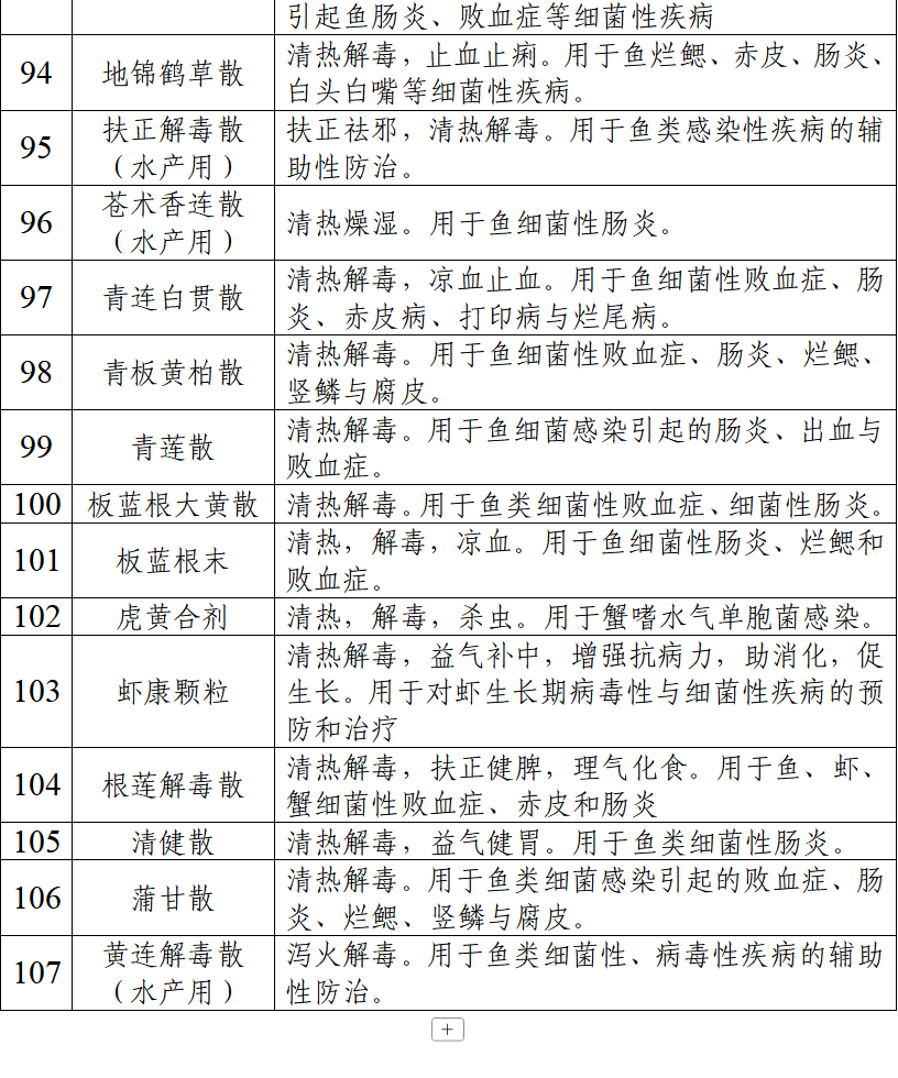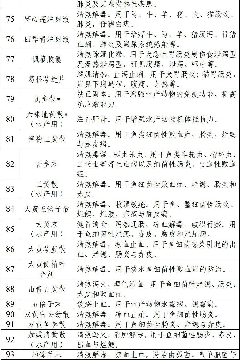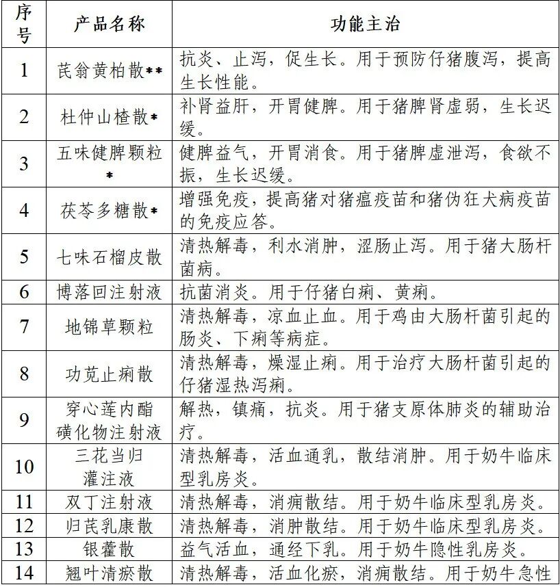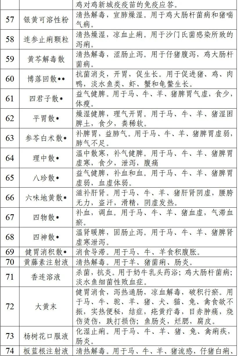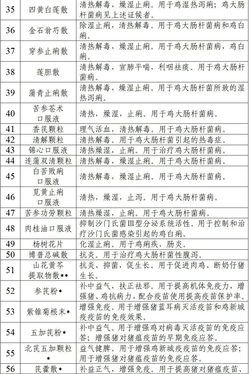 说明:本目录涵盖具有抗菌抗炎、扶正固本、促进动物生长功效的中药制剂107个。其中,用于细菌感染性疾病和证候的中药制剂71个;由具有“药饲同源”性质药材组成的中药制剂32个(以*标注);可长期或阶段性饲料添加的中药制剂4个(以**标注)。